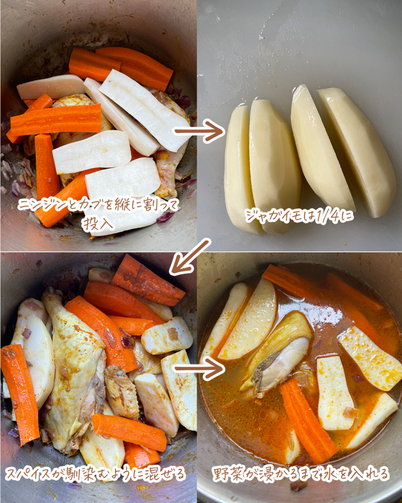 ポイントは全ての野菜を一度に入れるのではなく、最初は煮えるのに時間がかかる野菜(ニンジンやカブ、ジャガイモなど)を入れます。