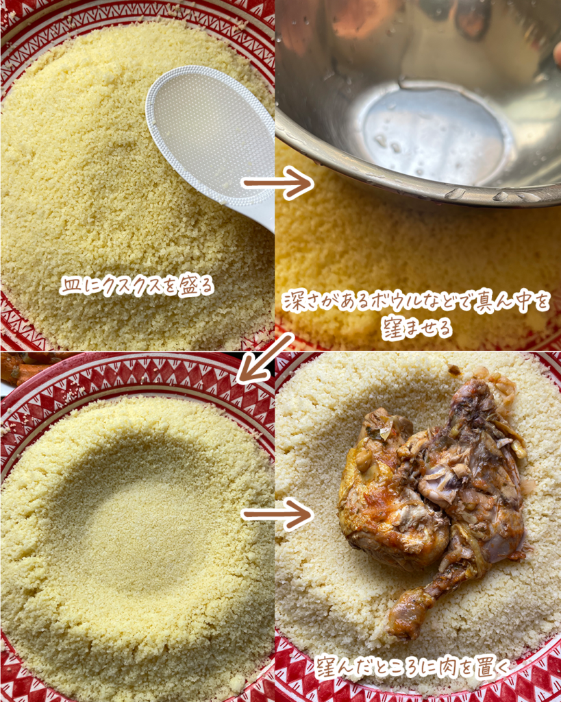 クスクスは肉を隠す形で盛り付けます。