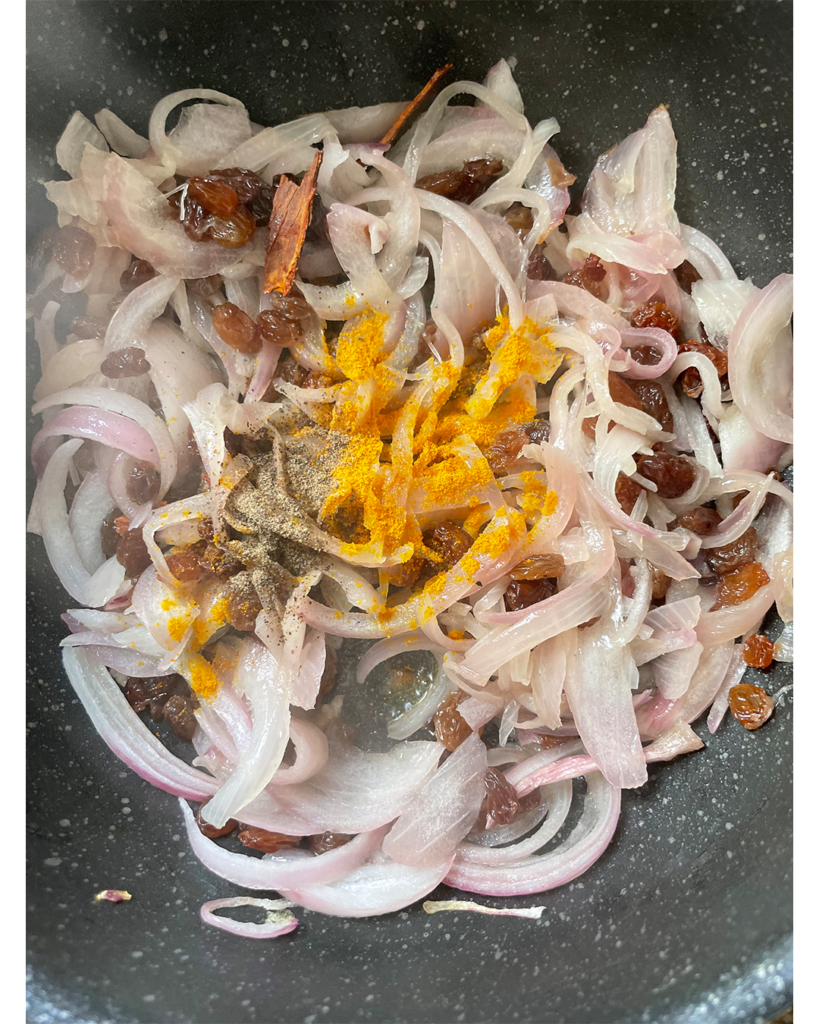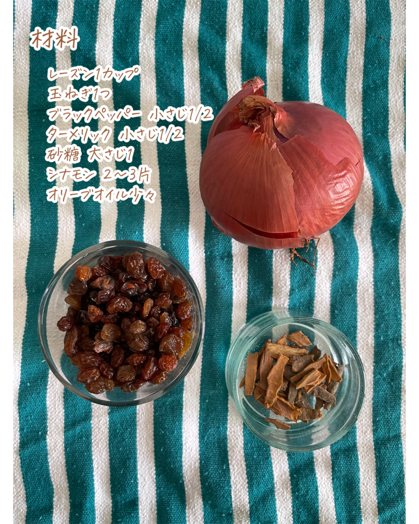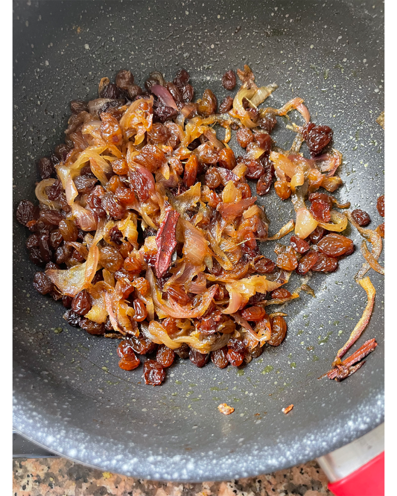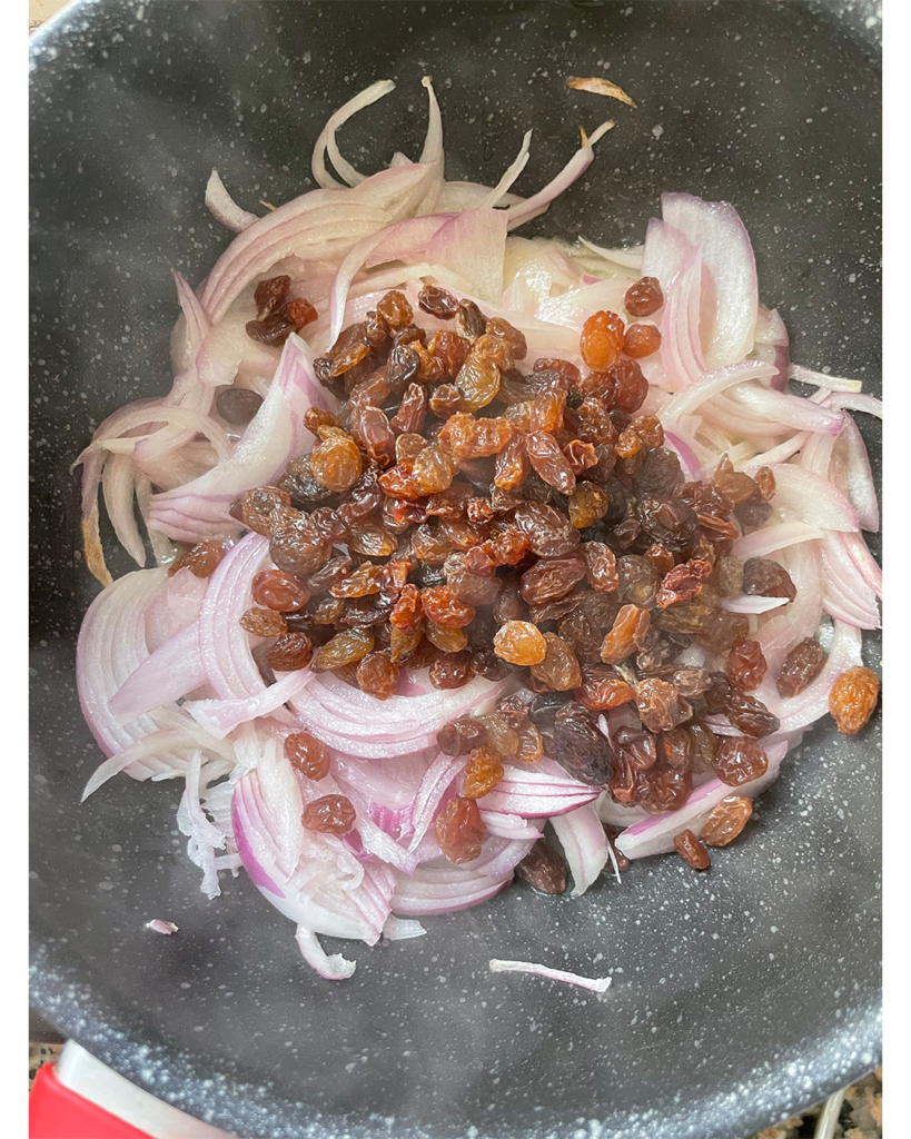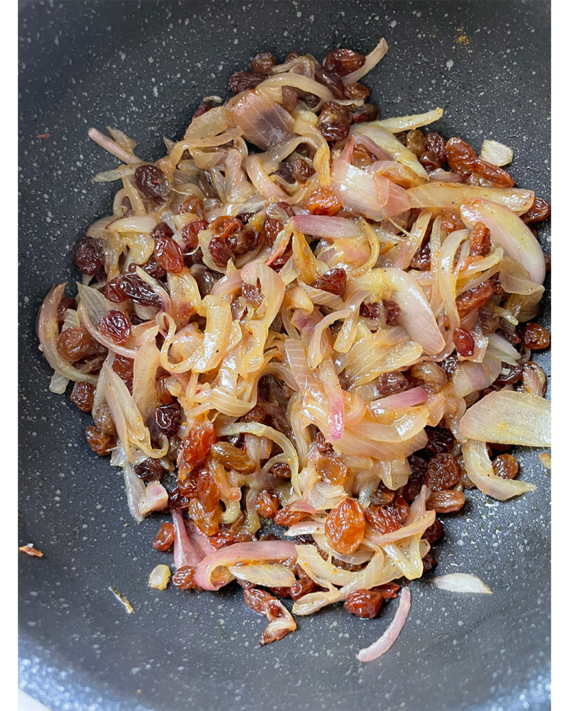おもてなしのクスクスではレーズンと玉ねぎを甘く煮込んだ「ツファヤ」をトッピングします。